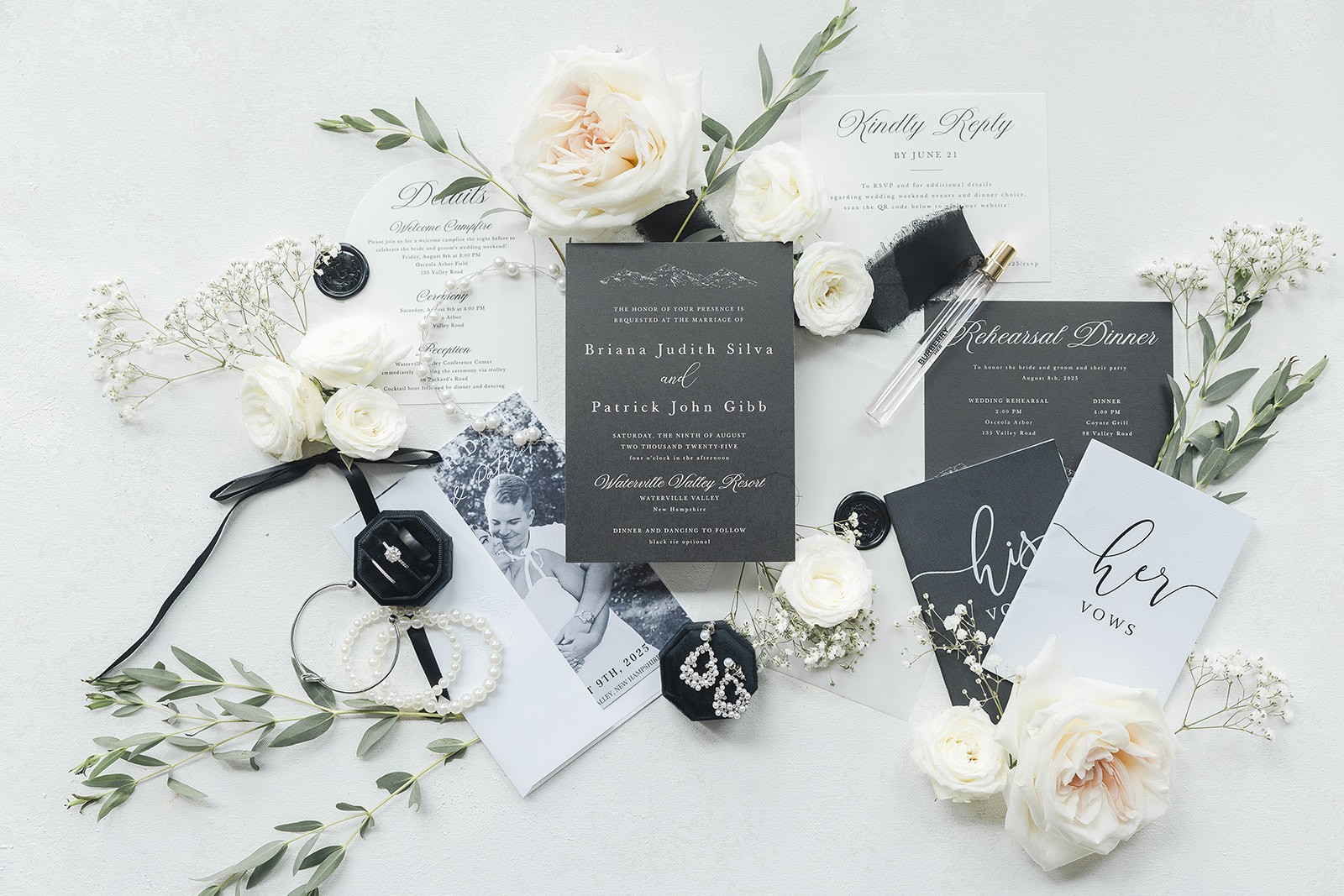 Briana and Patrick’s summer wedding in Waterville Valley was a romantic celebration wrapped in soft greens, glowing candlelight, and mountain air. Set against the lush New Hampshire landscape, the day felt effortlessly elegant, with eucalyptus woven throughout the design—its gentle movement and dark green tones created a stunning atmosphere. Soft whites paired beautifully with the surrounding scenery, allowing nature to feel like an intentional part of the décor rather than a backdrop. The bride was absolutely stunning, carrying a full, cascading bouquet of eucalyptus and roses, dahlias, and other white blooms that felt both romantic and refined. Each table was tastefully styled with layers of greens, delicate textures, and warm candlelight that flickered as the evening unfolded. The result was an intimate, elevated setting—one that felt serene, heartfelt, and unmistakably Briana and Patrick.